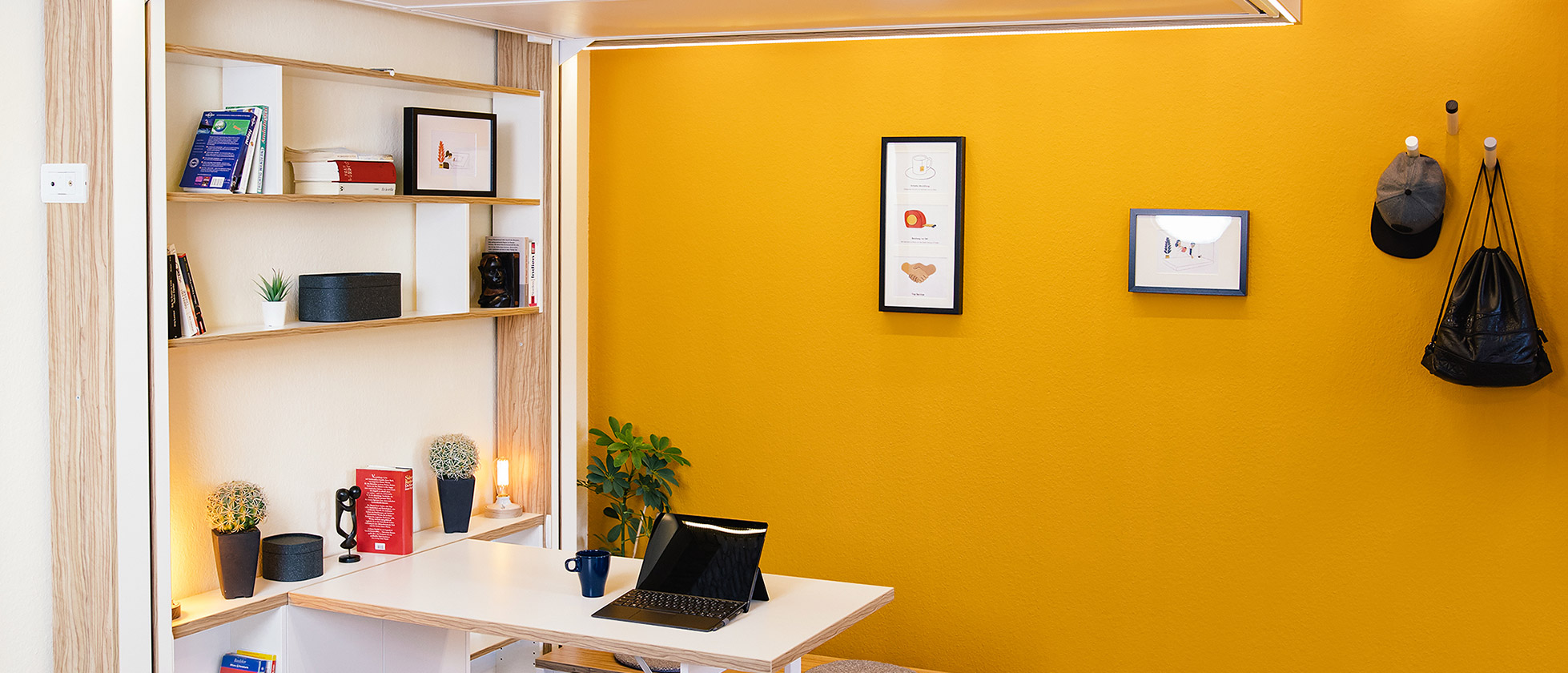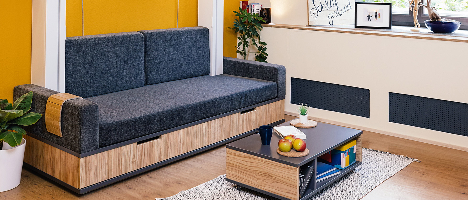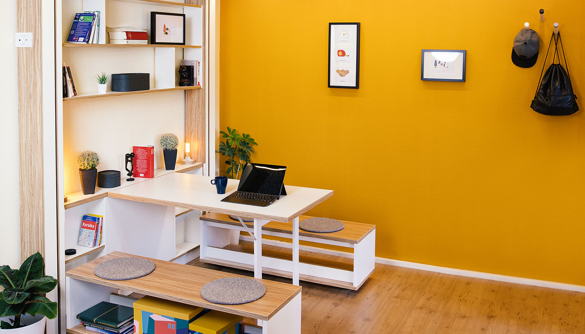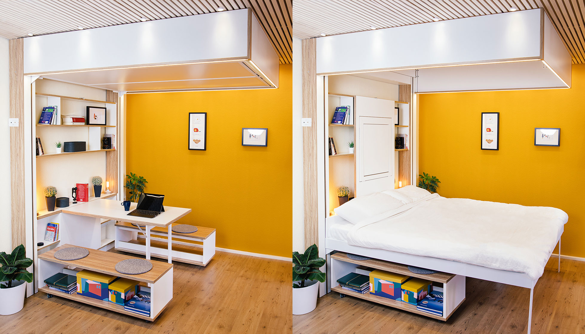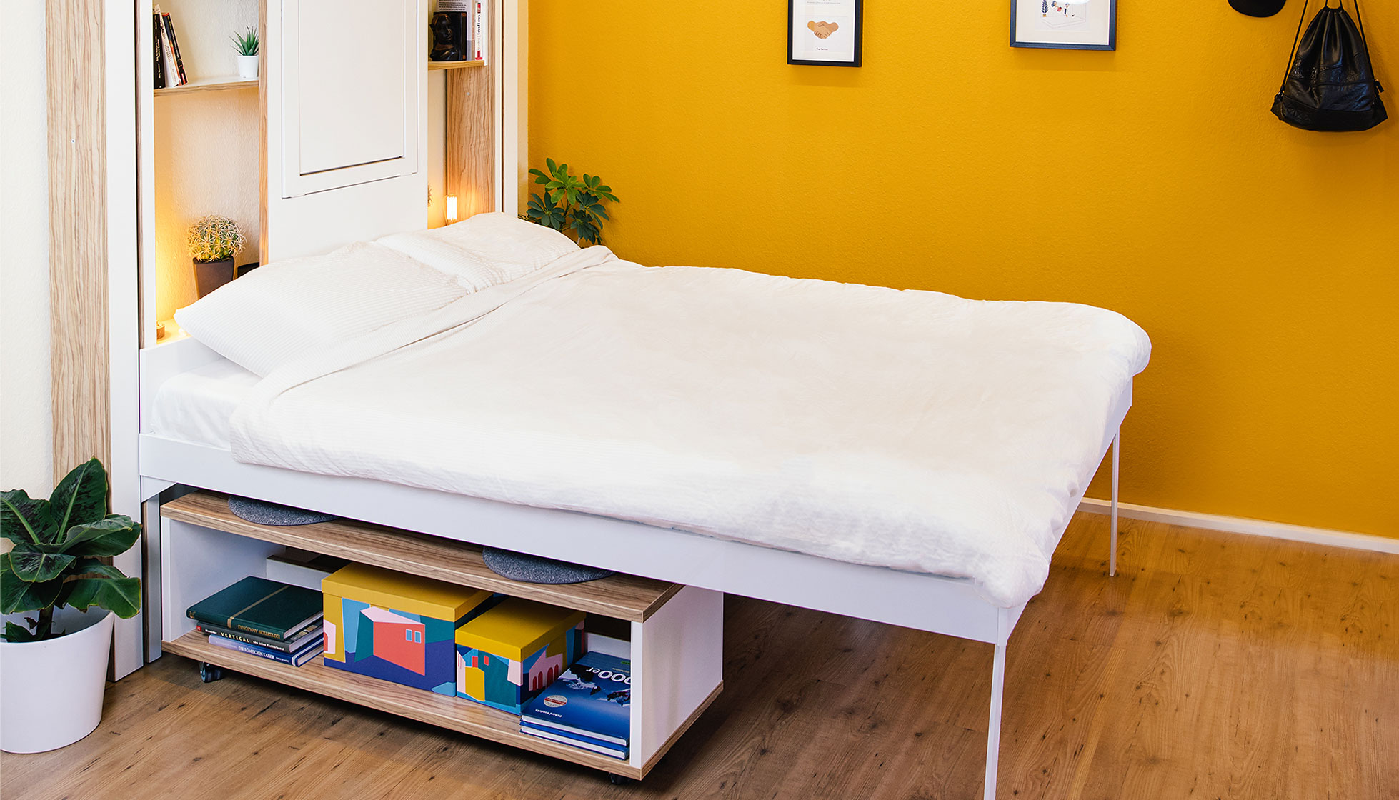 Tagsüber ein Büroplatz oder Essbereich für 4 Personen, in der Nacht gemütlicher Schlafbereich - das alles ermöglicht der Bett³ Desk. Lassen Sie Ihr Bett³ innerhalb weniger Sekunden per Knopfdruck in der Decke verschwinden und klappen Ihren Arbeits-/Esstisch mit einer Handbewegung auf. Zusätzlich können Sie die vielen Ablageflächen und Stauräume nutzen - so bleibt alles schön aufgeräumt und organisiert.